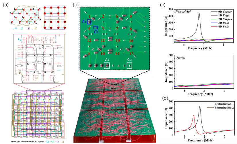 (8) 基于凝聚态物理系统中晶格与电子线路网络的一致性,设计了不同功能的经典电路并在实验上首次观察到了三维八极拓扑态,四维十六极拓扑态以及高阶安德森拓扑态等。进一步证明了依赖于初始赝自旋的逆安德森相变。这些工作充分证明了电路系统可以被用来观察在其它(经典和量子)系统中很难实现的新奇现象 (PRL126, 146802;PRB100, 201406(R); PRB102,100102(R); PRL130, 206401 (Editors' Suggestion)).