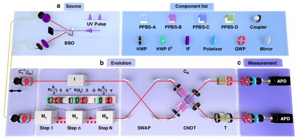 (4) 基于光量子行走平台, 实验上观测到拓扑保护的反常边界态, 实现了完美纠缠态的传输和转化, 设计并实验实现了拓扑保护的纠缠态手性开关和鲁棒量子纠缠态产生 (PRL121, 100501; LSA 13, 167;LPR14, 2000092;LPR16, 202100519; LPR18, 202300794)。